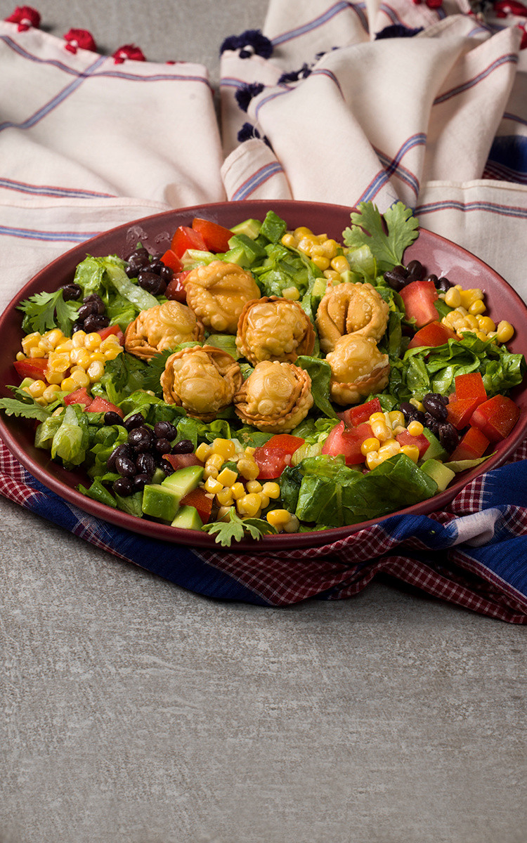 Prepare a cilantro-lime vinaigrette. Fry the ravioli in sunflower oil at 350° for about 2 minutes or until golden brown. Toss the lettuce with the vinaigrette. Add the corn, avocado and black beans and tomato. Garnish with the Cheese Tortelloni croutons. Buon Appetito!